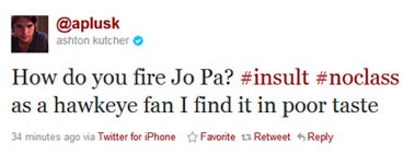 The big “oops” here was tweeting a strongly worded opinion about a current event without actually knowing the whole story. (This is how rumors and hear-say start, people.) Just hours after Joe Paterno’s firing in light of the children sexual abuse scandal at Penn State, Kutcher posted the following tweet: